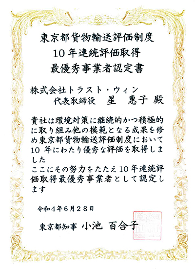 2022年6月28日:東京都貨物輸送評価制度セミナーが開催され、その場におきまして当社、株式会社トラスト・ウィンは「10年連続評価最優秀事業者」として、表彰をして頂きました!