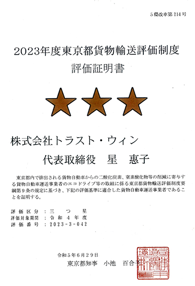 | 業務 | 運輸・倉庫事業 一般貨物自動車運送事業 貨物自動車利用運送事業 許可番号 関自貨第1910号 産業廃棄物収集運搬業 東京都貨物輸送評価制度 ☆☆☆ |