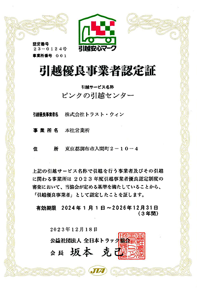 | 引越安全マーク | 認定番号23-0124 安全・安心な引越サービスを提供引越事業者に対し、全日本トラック協会が認定する「引越安心マーク」を取得しております。