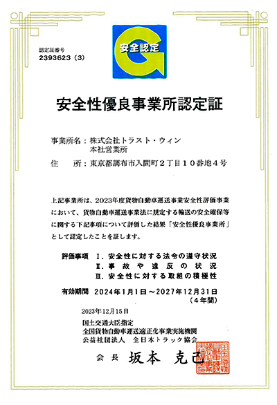 トラック運送事業者の交通安全対策などへの事業所単位での取り組みを評価し、 一定の基準をクリアした事業所を社団法人全日本トラック協会が認定する貨物自動車運送事業安全性評価事業(Gマーク)を実施しています。
